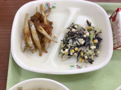 ごはん わかさぎの南蛮漬け ひじきとチーズのサラダ ふだま汁