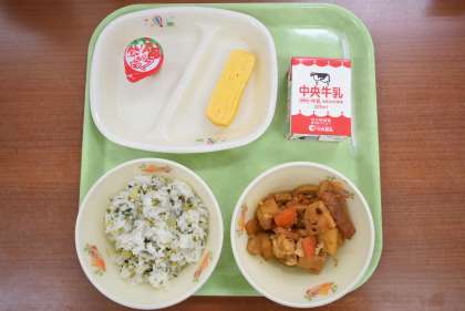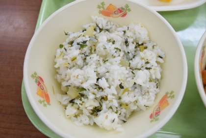 今日(1月7日)は人日の節句です。1年間の健康を祈り、春の七草が入った七草がゆを食べる風習があります。給食では、松平地区の七草を使用し、七草ごはんにしました。子供たちが健康に過ごせることを祈っています。