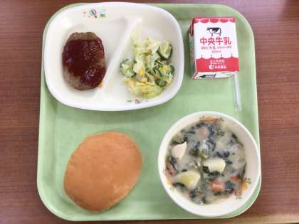 サンドイッチバンズ ハンバーグ コールスローサラダ ほうれん草のクリームシチュー
