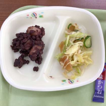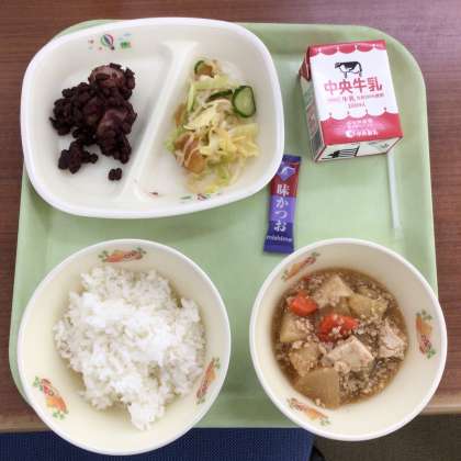 ごはん かつおふりかけ ポリポリサラダ ぜんざい だいこんのそぼろ煮