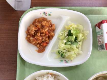 今日は「タコライス」にしました。麦ごはんにタコライスの野菜とタコライスの具をのせて、混ぜながら食べます。タコライスの具にはチリパウダーをきかせて、ピリ辛に仕上げています。