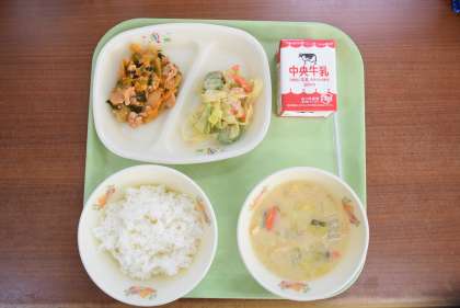 今日は豊田市産の白菜から作ったキムチを使用した「ぶたキムチ炒め」です。キムチの辛さが食欲をそそります。