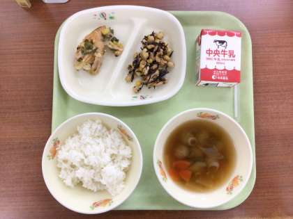 ごはん とり肉の香味焼き 大豆とひじきのサラダ いわしのつみれ汁