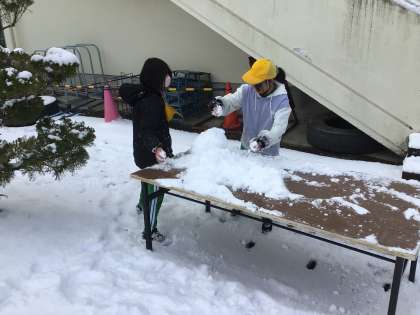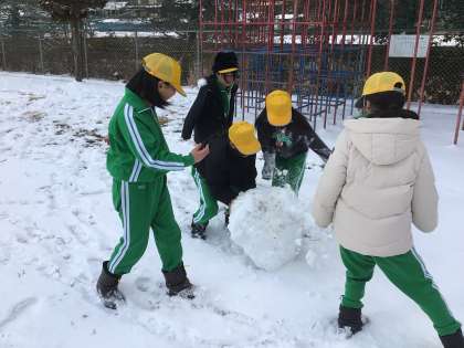 運動場に雪が積もり、雪遊びをしました。仲間と協力して大きな雪玉を作ろうと頑張りました。