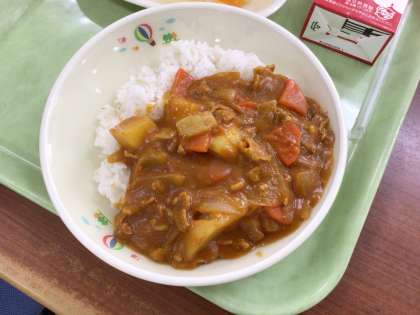 今日はカレーライスです。2種類のルウを混ぜ合わせ、隠し味に様々な調味料を入れて、味を調えました。よくかんで、たくさん食べてほしいと思います。