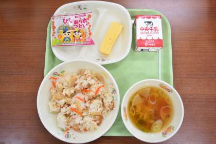 今日はひなまつり献立です。ひなまつりには女の子の成長を祈り、ひなあられなどの特別なお菓子と、ごちそうを食べます。給食のひなあられは、パプリカパウダーや あおのり などの自然の色で色付けされたものです。よく食べて健やかに成長してほしいと思います。
