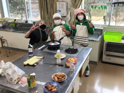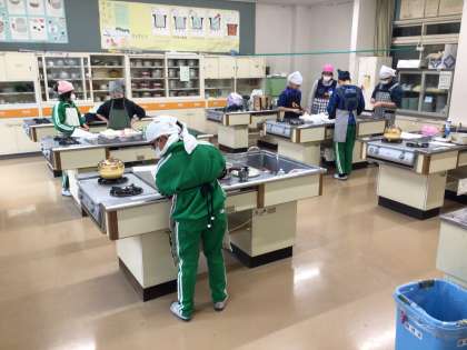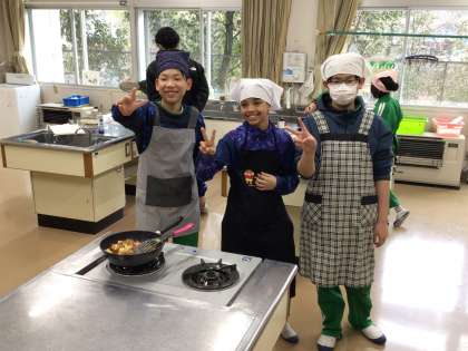 家庭科で、ジャーマンポテトやえのきのベーコン巻き、スープを作りました。ジャガイモの皮をむいたり、玉ねぎを切ったり、仲間と協力して美味しい料理に仕上げることができました。