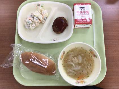 今日の給食は、みんなが大好きなハンバーグにしました。