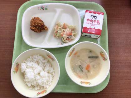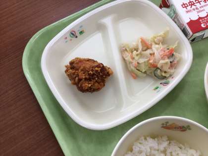 給食の唐揚げは、しょうゆ と しょうが で下味をつけて、片栗粉をまぶして揚げています。