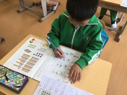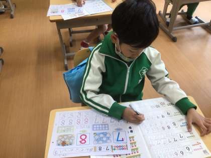 数字の練習をしました。8や9を書く時の書き始めの位置や丸い形に注意して書いていました。