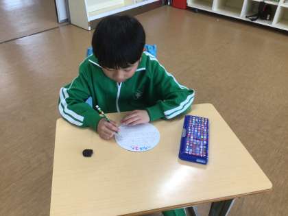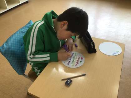 金曜日の1年生を迎える会の準備をしています。1年生渡すメダル作りに夢中でした。