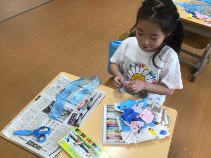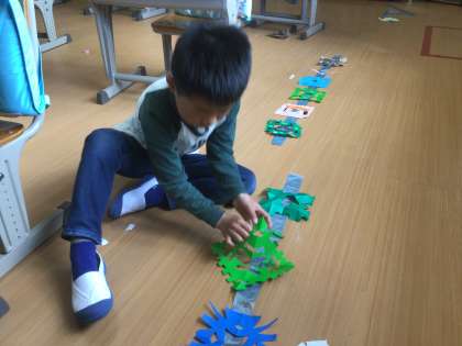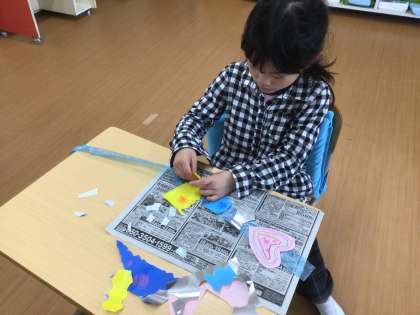 図工の時間に折り紙をハサミで切って飾りを作っていました。賑やかな飾り付けができそうです。