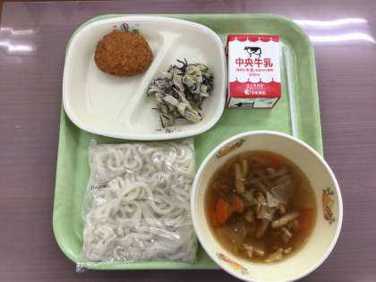肉うどん キャベツ入りミンチカツ ひじきとさつまいものサラダ