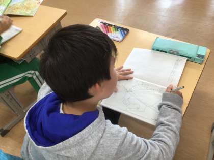 社会科で愛知県の特色について意見を出し合い、白地図にまとめていました。