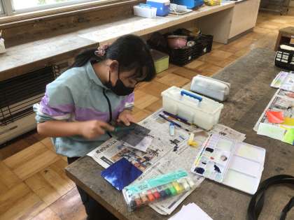図画工作科で色や形から気持ちを表現する学習でした。さまざまな道具も使って工夫して気持ちを表していました。