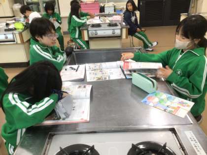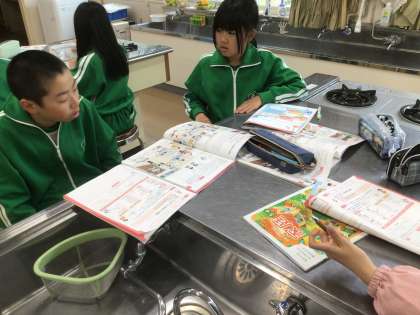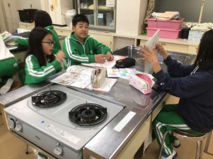 家庭科の時間です。家庭科の時間に使う道具について役割も含めて出し合っていました。