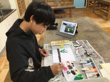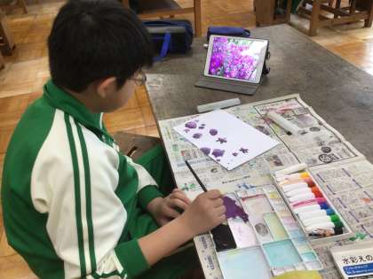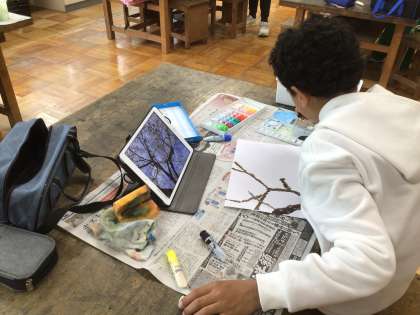 春の様子をタブレットで撮影し、それを画用紙に描いていました。鮮やかな色づかいができていました。