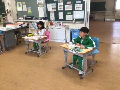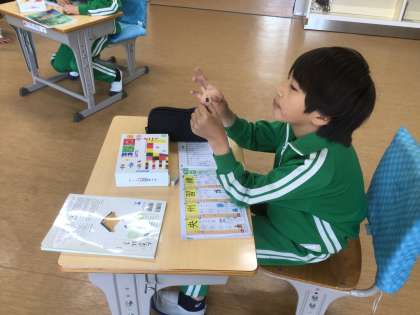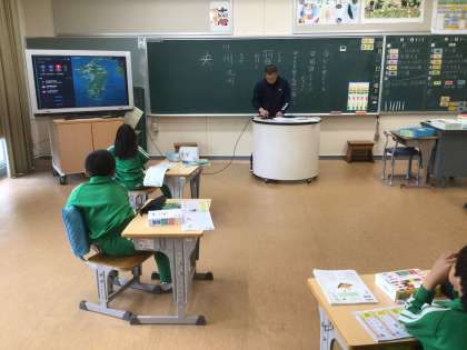 漢字の学習です。「州」の字について、九州の地図を使って話し合っていました。