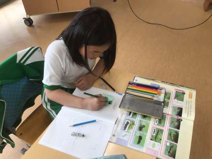 理科でモンシロチョウの育つ方についてまとめていました。幼虫の絵がとても上手でした。