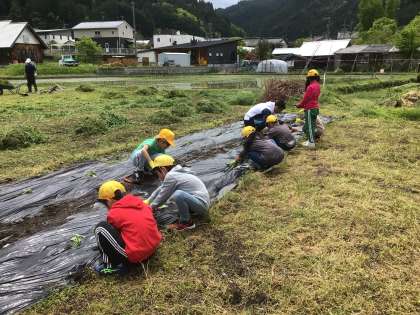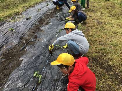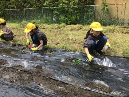 職員駐車場奥にある畑でさつまいもの苗を植えていました。出てきたミミズに大騒ぎしている子もいました。