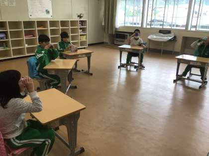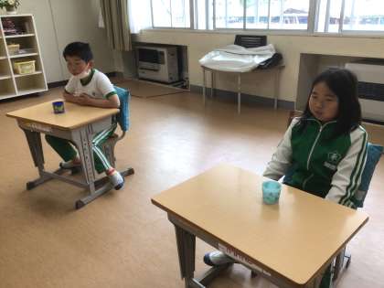 本日よりフッ化物洗口が始まりました。味に慣れないようでしたが、30秒間しっかり洗口できました。