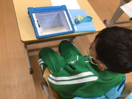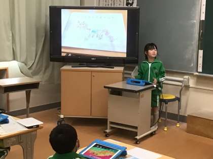 算数の学習です。いろいろな形を使って好きな絵を描きました。タブレットを使ってみんなに発表しました