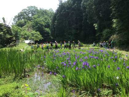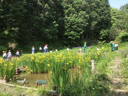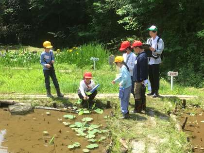 西広瀬小学校へ交流学習に出かけました。すばらしいビオトープに案内してもらいました。