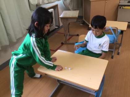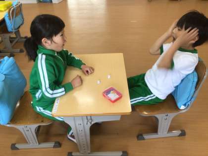 算数の時間です。2人でサイコロをふり、合わせて7になればOKというゲームをしています。楽しみながらたし算の学習をしていました。