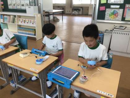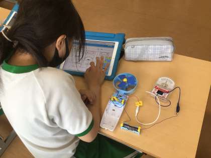 理科の時間です。乾電池の向きを変えるとプロペラの回転に変化があるのかなどについて実験しながら記録していました。