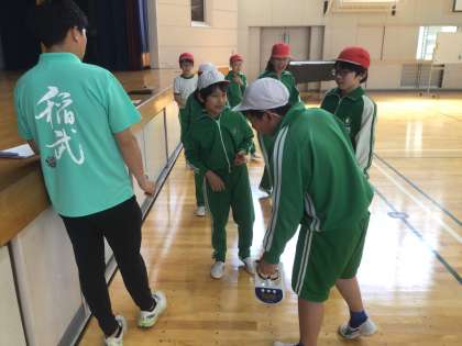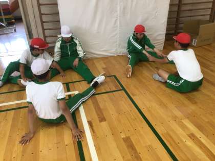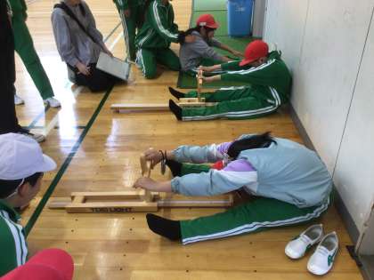 体育室で体力テストをしていました。長座体前屈と握力の測定中でした。少しでもよい記録を出そうとがんばっていました。