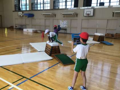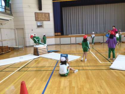 体育で跳び箱の練習をしています。タブレットで動画を撮り合って良いところやもう少しのところを確認しながら進めていました。