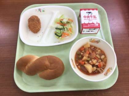ツイストパン ポークビーンズ コーンコロッケ かんきつサラダ