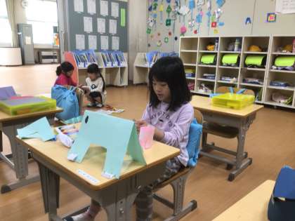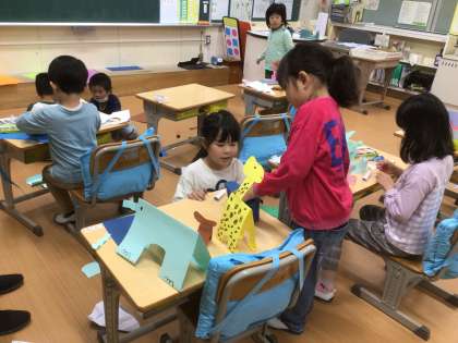 図工の時間です。紙の折り方を考えて好きなものを作っていました。いくつもの動物が出来上がっていました。