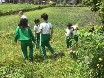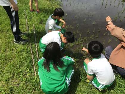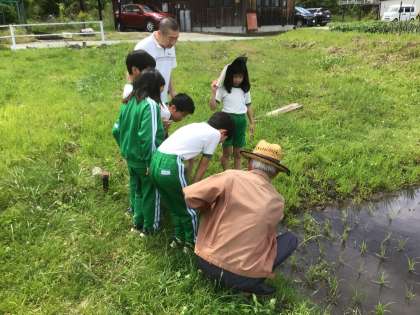 教室で育てている生き物の餌を探していました。田んぼを見ておられた方にセリを教えていただき、収穫することができました。