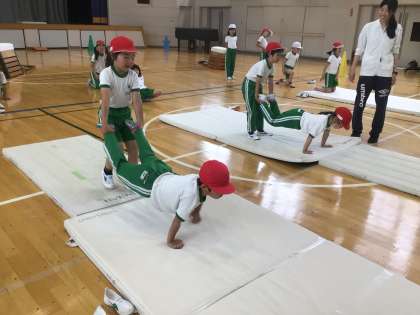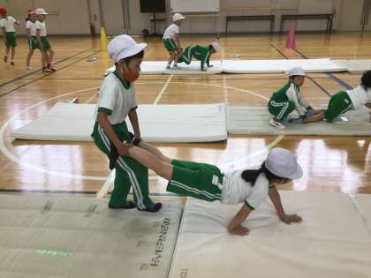 マット運動あそびの時間です。「ゆりかご」や「手押し車」が上手にできるようになってきました。