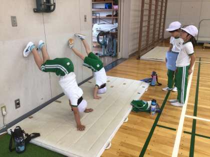 体育の時間です。ペアやグループになって倒立の練習に励んでいました。