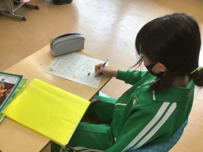 校外学習や福祉学習でお世話になった方へのお礼のお手紙を書いています。お話を聞いてわかったことや考えたことなど、自分の思いが伝わるお手紙にしたいですね。