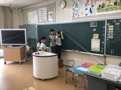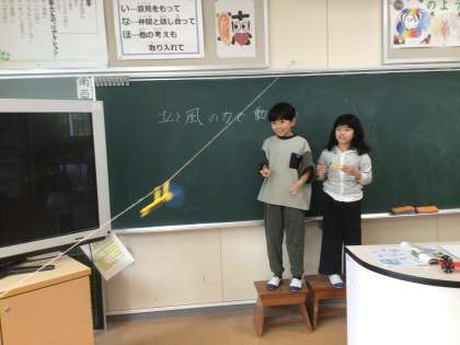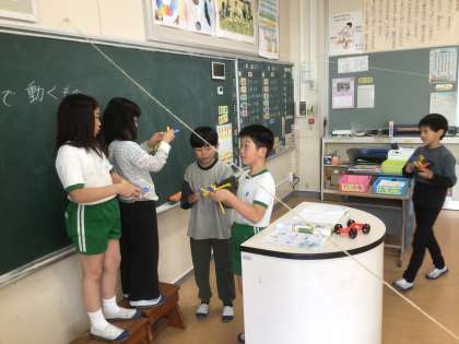 理科の時間です。ゴムや風で動くおもちゃを使って、誰のものがスムーズに進むかを競いながら楽しんでいました。