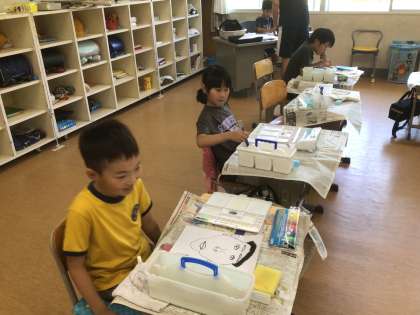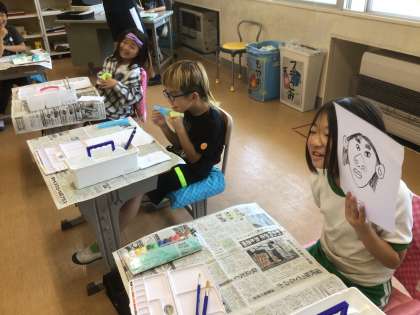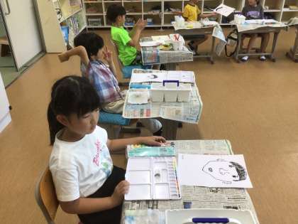図工の時間です。画用紙に書いた自画像に色づけをしようという場面でした。自画像を見せるのを恥ずかしそうにしている子もいました。
