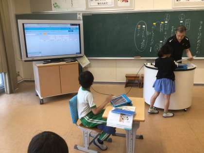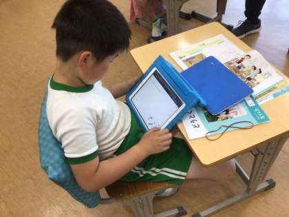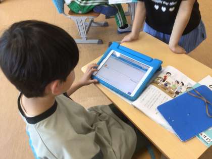 道徳科の「きまりはだれのため」という教材の学習です。学習用タブレットのポジショニングを使ってそれぞれの思いを共有しながら、きまりについて考えていました。