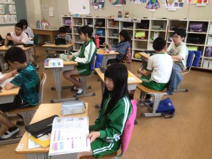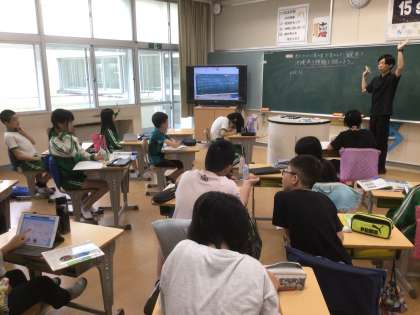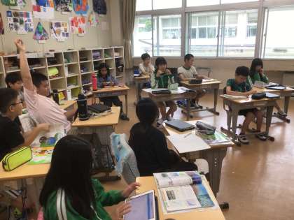 社会科の時間です。あたたかい土地のくらしの学習で、沖縄について意見を出し合っていました。