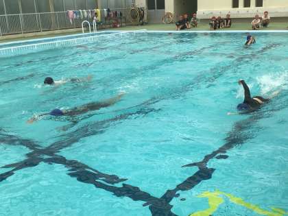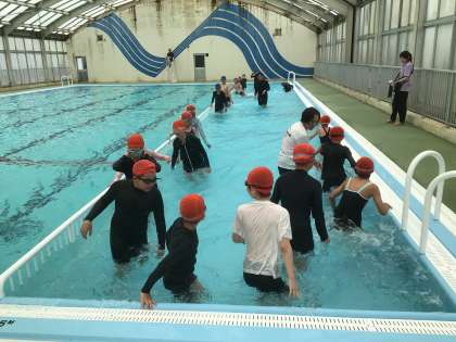 高学年は今日が初めての水泳でした。体を十分に水に慣らした後、現在の泳力を測定しました。