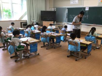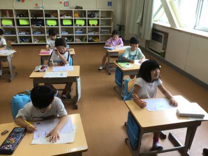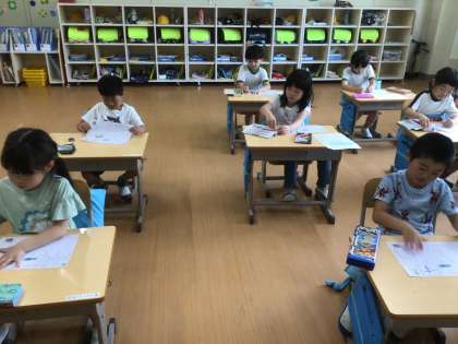 ひらがなの「す」の練習をしていました。くるっとまわすところが難しそうな子が多くいました。