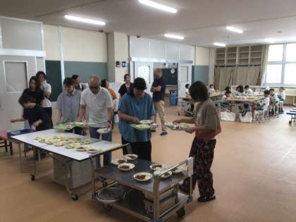 1年生が保護者のみなさんと一緒に給食を食べました。とてもいい笑顔で食事を楽しんでいました。