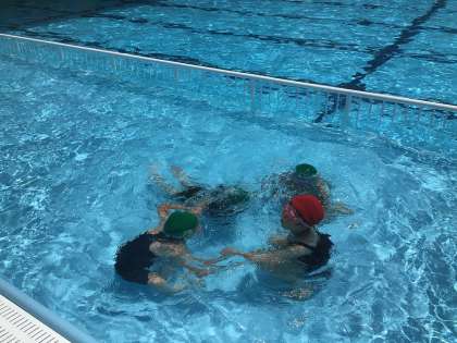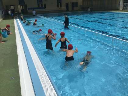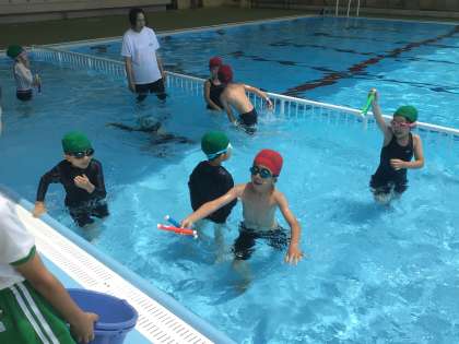 今日は全学年プールに入りました。1・2年生は、顔を見ずにつける練習をしたり、潜って棒を取るゲームをしたりして活動しました。