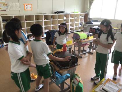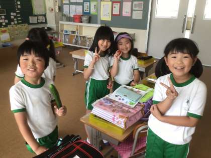 掃除後の放課の教室です。体育室に遊びに行こうかと迷っているところでした。とれたての野菜を見せてくれました。