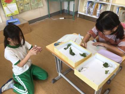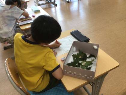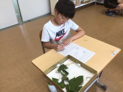 お蚕さんの観察日記を書いていました。ほとんどのお蚕さんは、繭をつくって成虫になっています。お世話をした分、喜びも大きいようです。