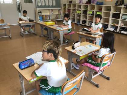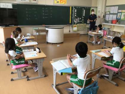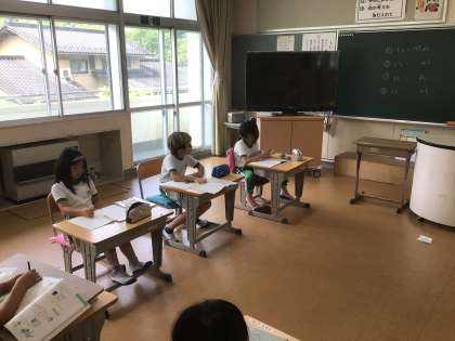 こちらも算数の時間です。容積についての学習でした。1リットルは何ミリリットルになるかの質問に答えを出すのが大変そうでした。デシリットルの単位も含めてしっかり整理する必要がありますね。