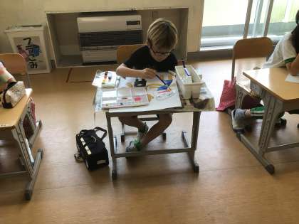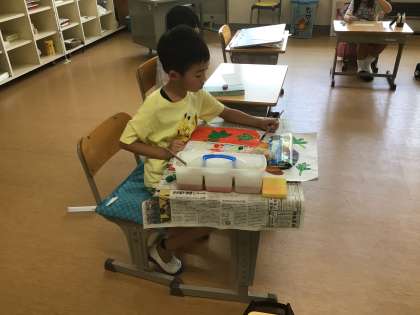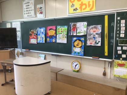 図画工作科の時間でした。完成した子の絵については黒板に掲示されていました。なかなかの力作揃いです。
