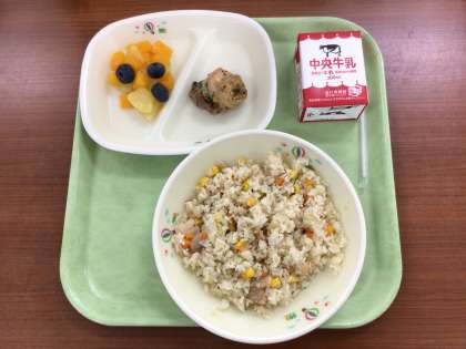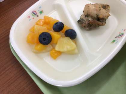 コーンピラフ とり肉のハーブ焼き ブルーベリーポンチ
